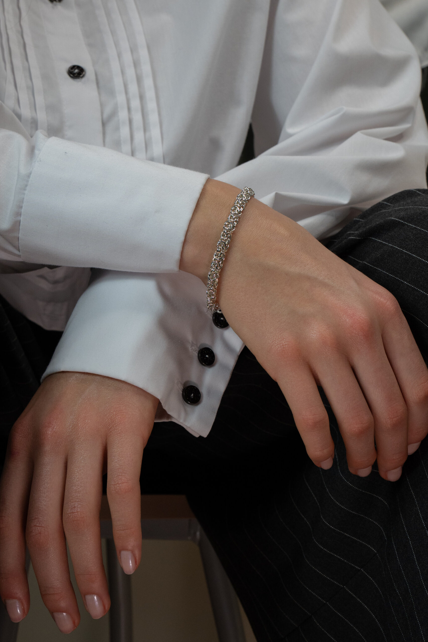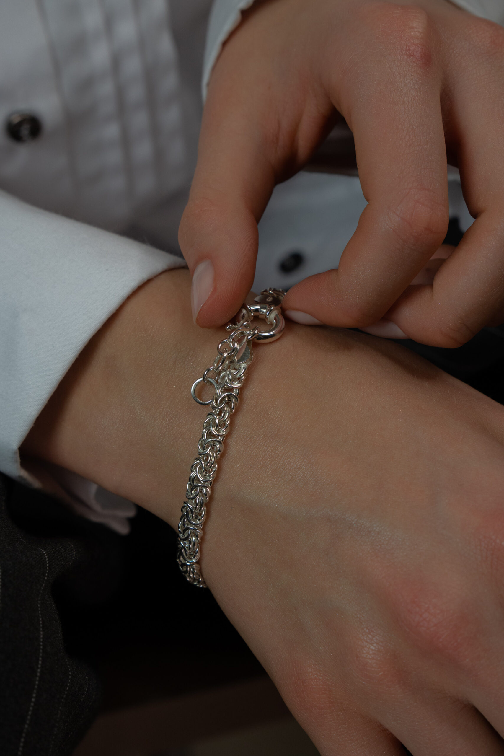 - Rankų darbo sidabro apyrankė su daugybe subtilių gijų susipinančių į vieną harmoningą pynę, simbolizuojančią stiprybę ir vienybę