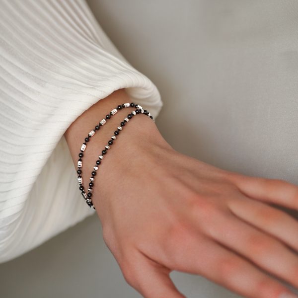 - Rankų darbo apyrankė pagaminta iš graviruotų juodo ir balto sidabro karoliukų, todėl lengvai derinama prie kitų spalvų ir tekstūrų papuošalų