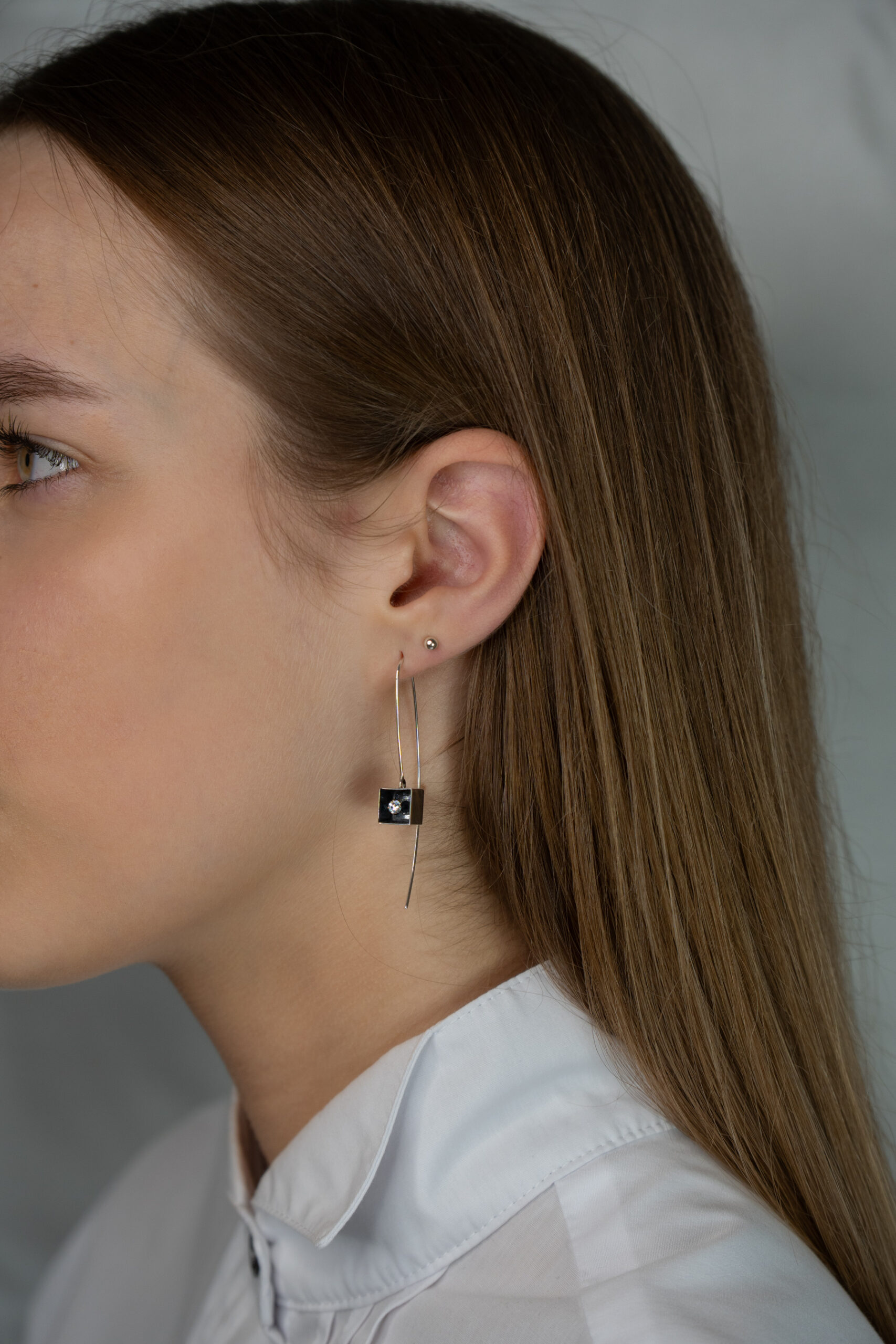 - Rankų darbo sidabriniai modernaus dizaino auskarai su kabančiais kubais ir cirkonio akute viduje