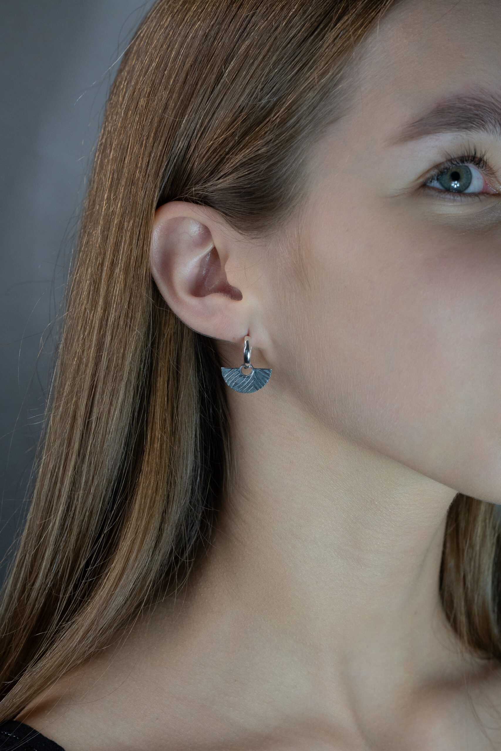 - Modernaus dizaino rankų darbo auskarai su rinkutėmis ir kabančiu raštų motyvu ant tamsinto sidabro
