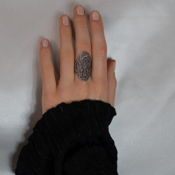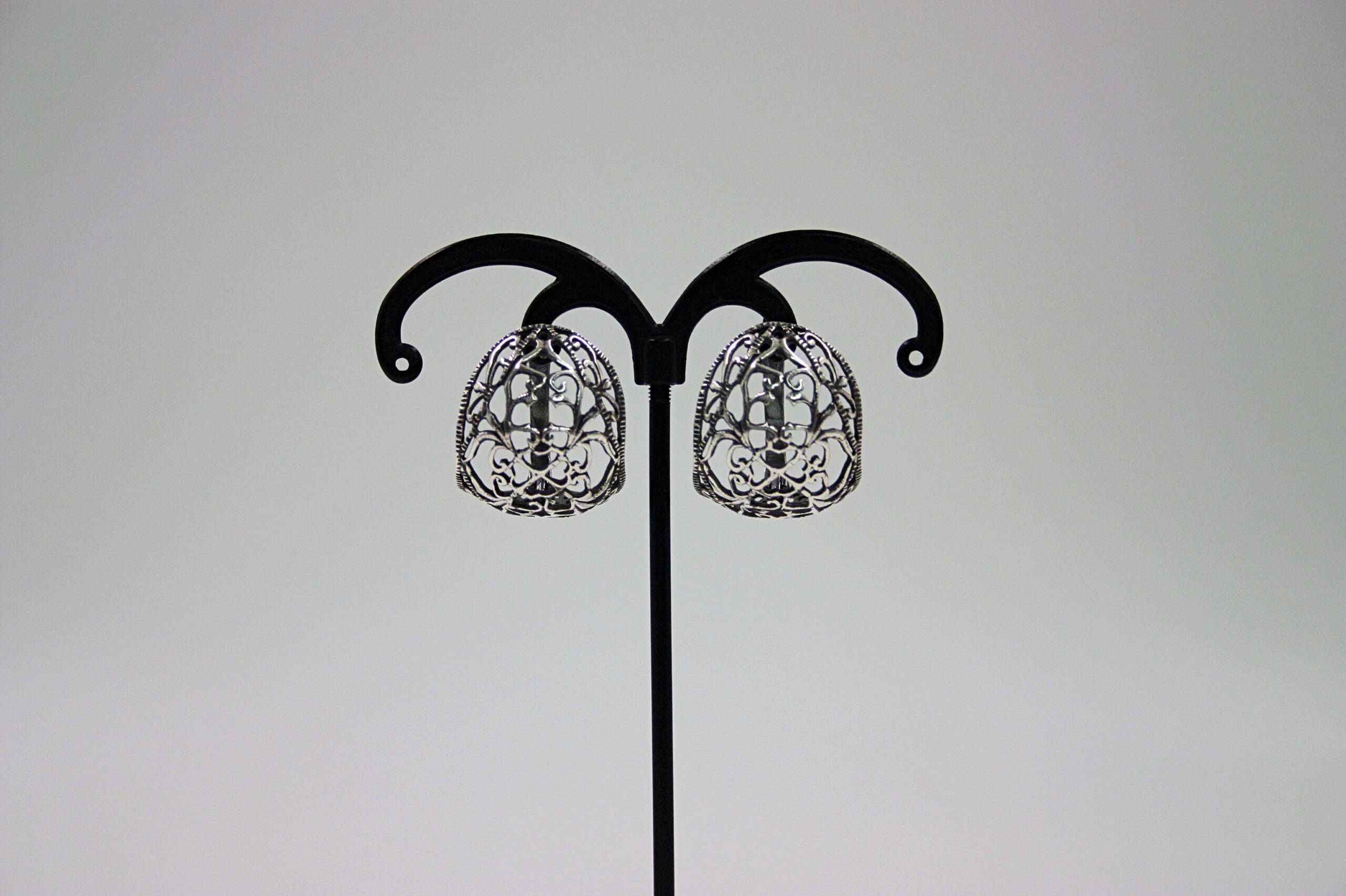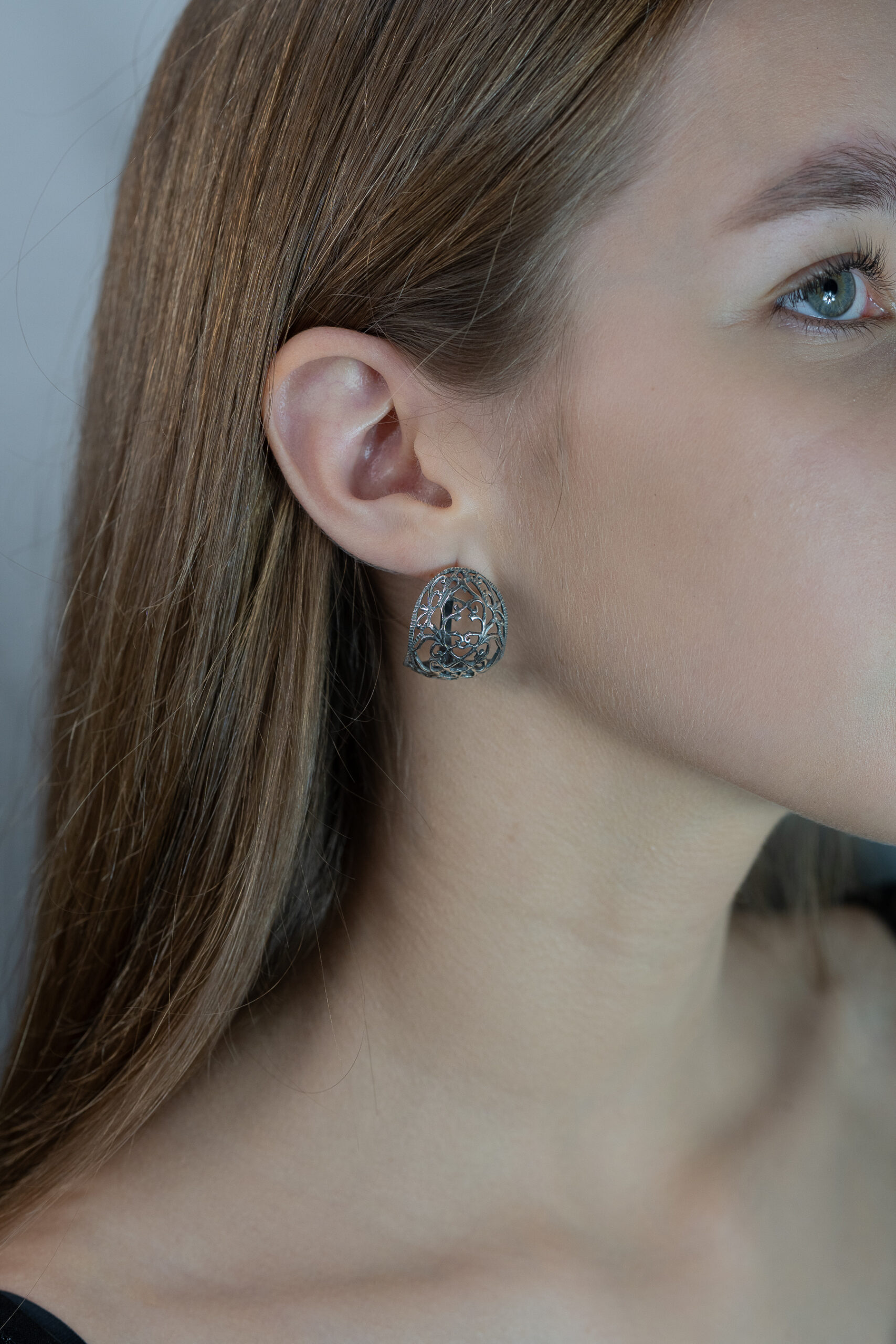 - Ažūrinio rašto rankų darbo sidabriniai auskarai, įkvėpti senųjų ornamentų, subtiliai pabrėžia eleganciją ir paslaptingą charakterį