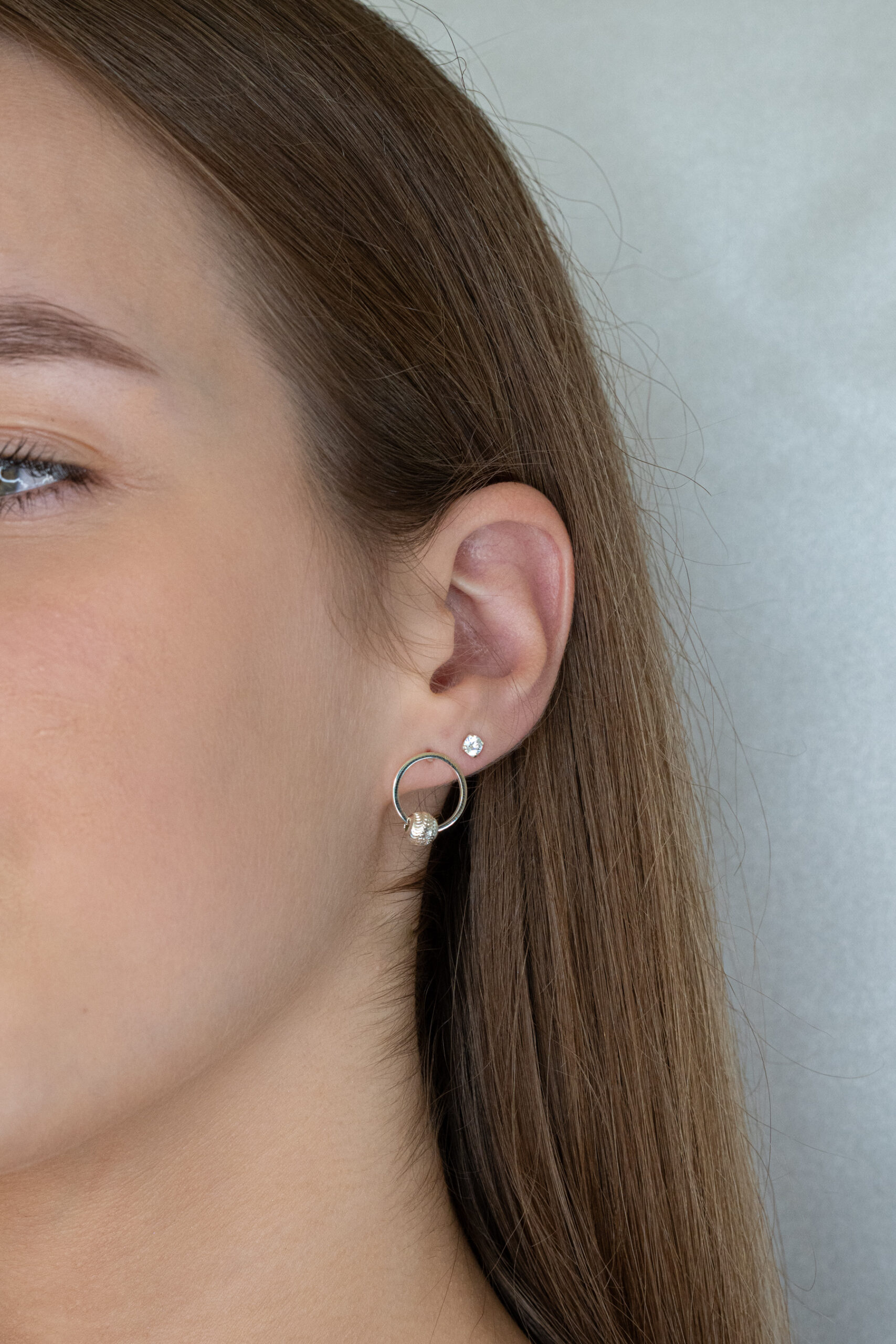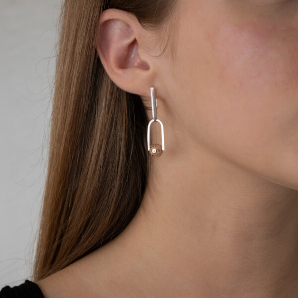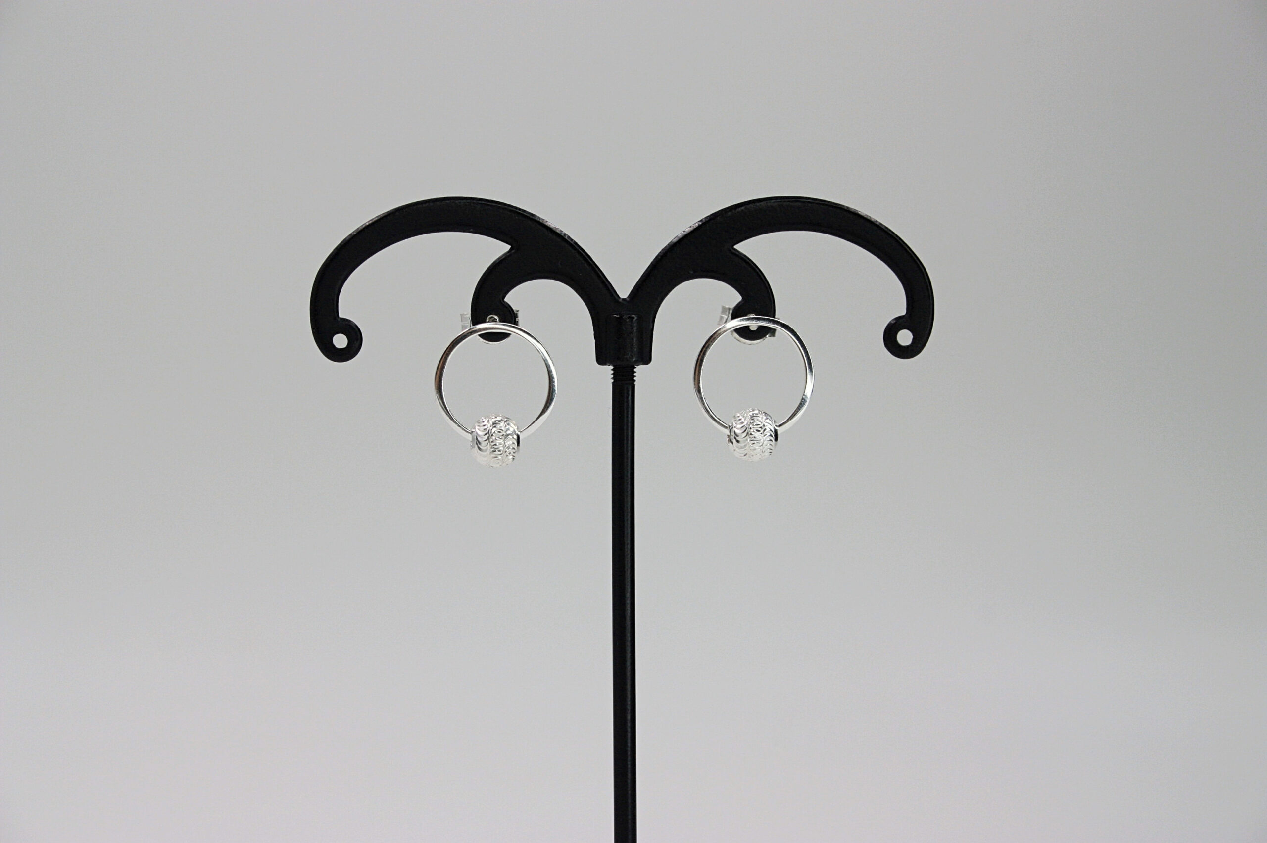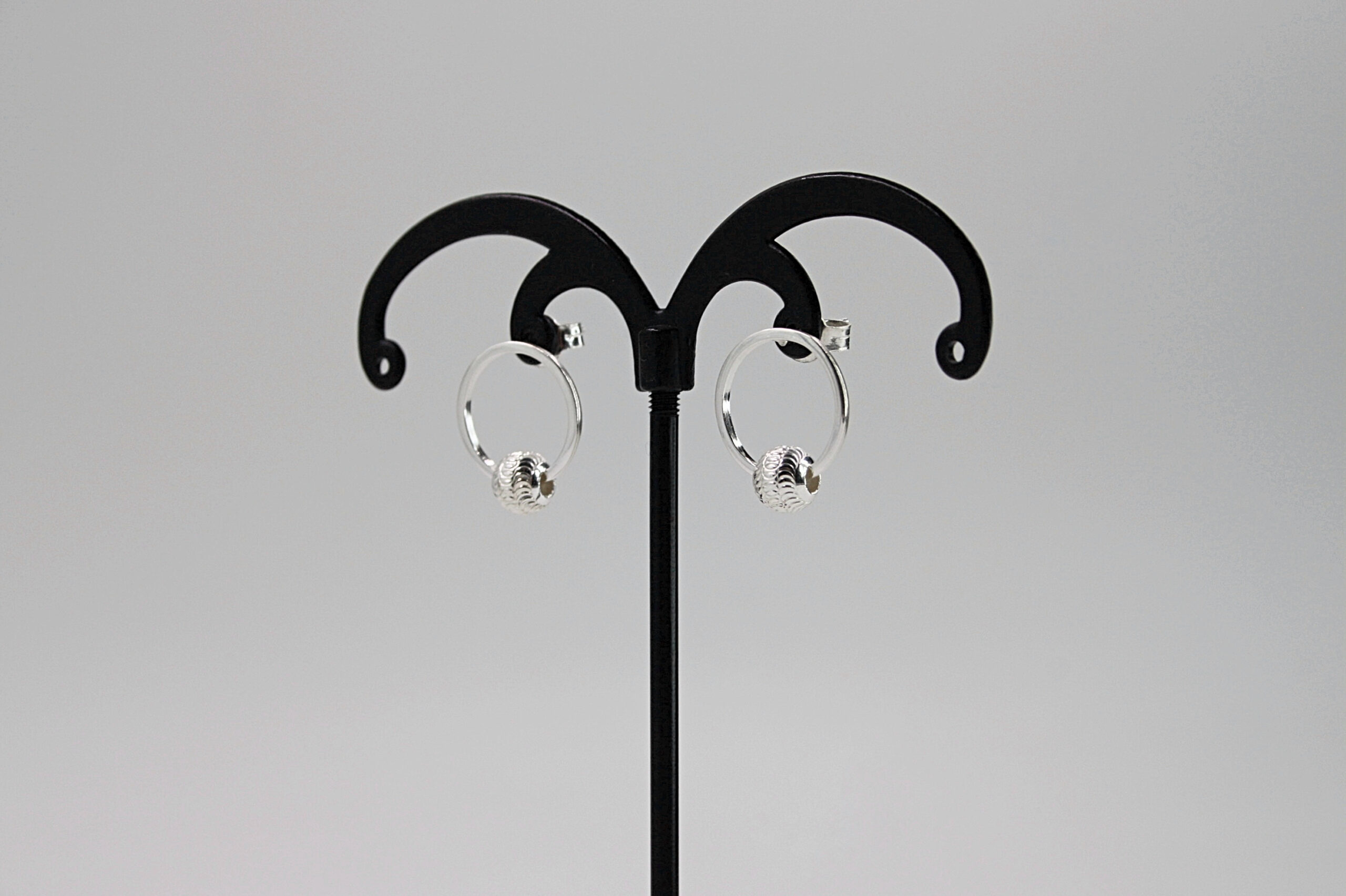 - Rankų darbo auskarai su apskritimu ir ant jo “besisupančiu” graviruotu burbuliuku