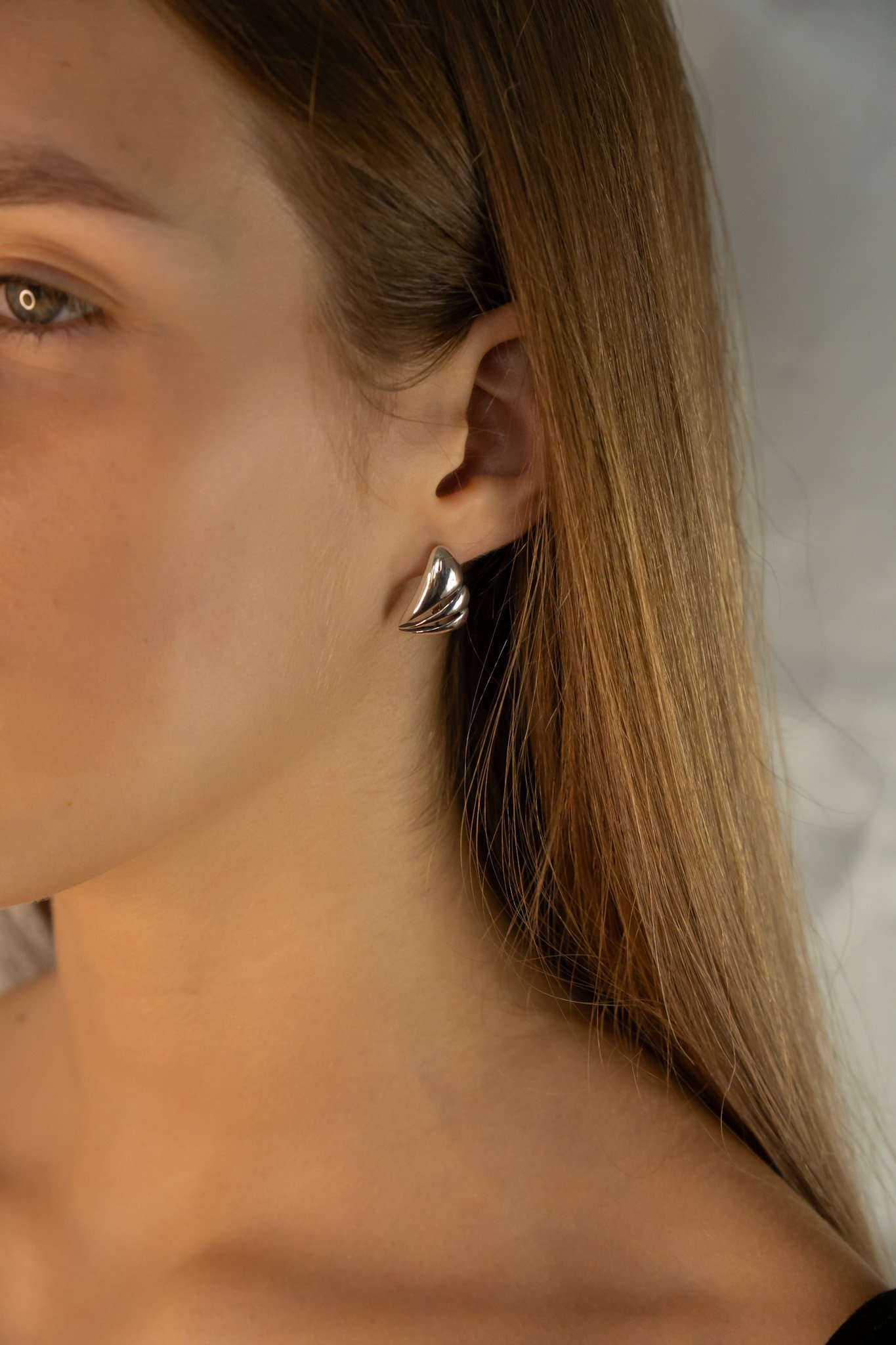 - Rankų darbo sidabro auskarai su trimis skirtingomis dalimis sudarančiomis išskleistų sparnų įvaizdį subtiliai atspindi šviesą ir suteikia elegancijos