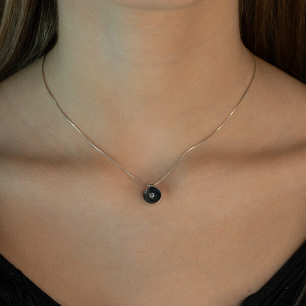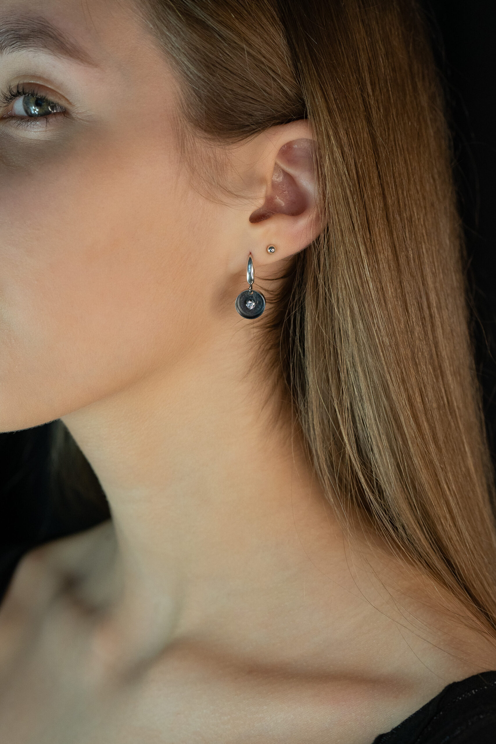 - Rankų darbo auskarai su tamsinto sidabro uždarais ratukais ir šviesia cirkonio akute viduryje, šviečiančia tarsi viltis tamsoje