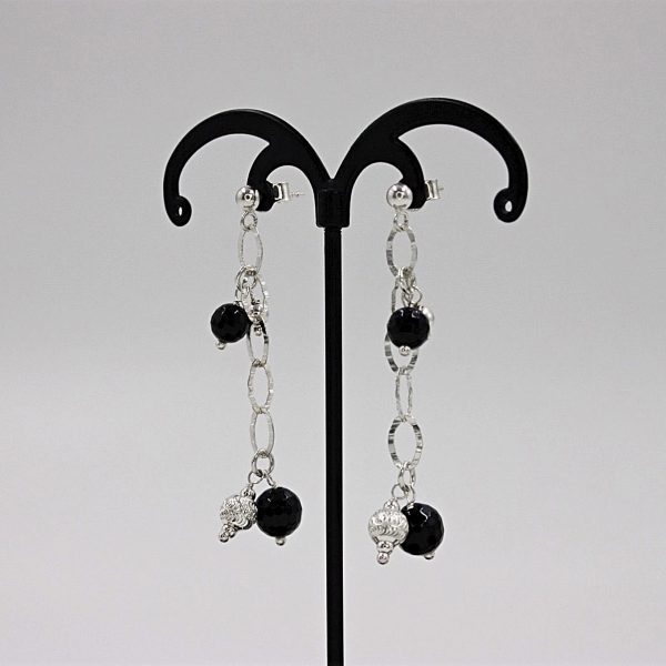 - Rankų darbo kaklo papuošalas iš onikso ir sidabro burbuliukų (iš viso trys “kekės”) kabančių priekyje 5 cm. atstumu vieni nuo kitų