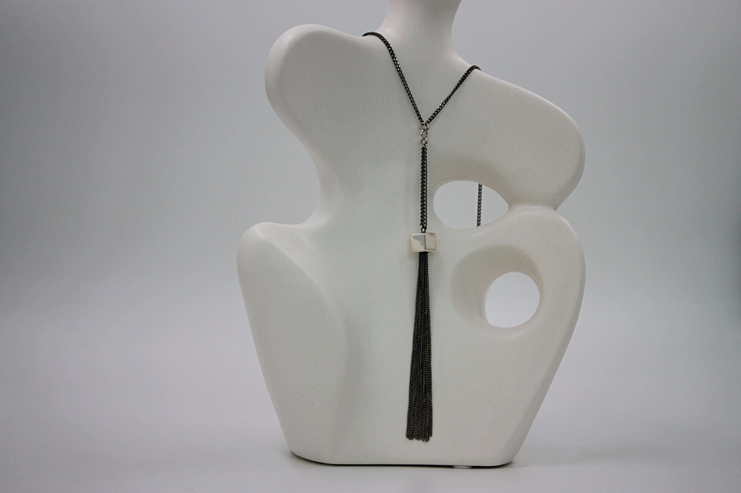 - Rankų darbo kaklo papuošalas su kvadratu ir kabančiomis grandinėlėmis