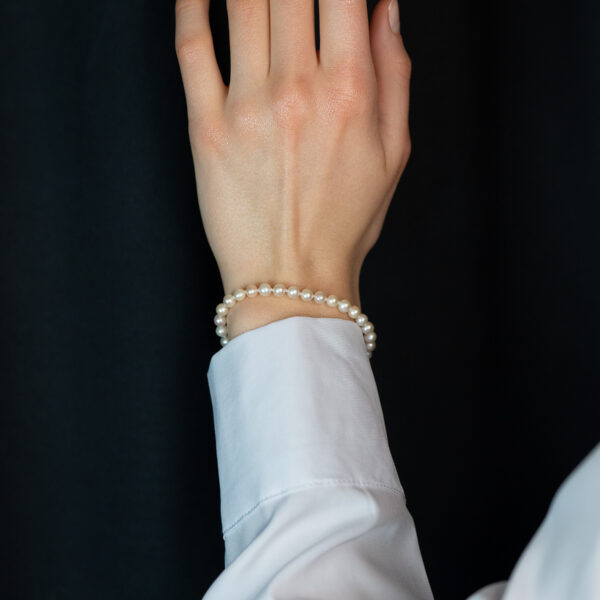 - Subtilūs pailgi gėlavandeniai perlų karoliukai kuria švarią, elegantišką liniją, kuri tyliai pabrėžia natūralų rafinuotumą ir laikui nepavaldų grožį