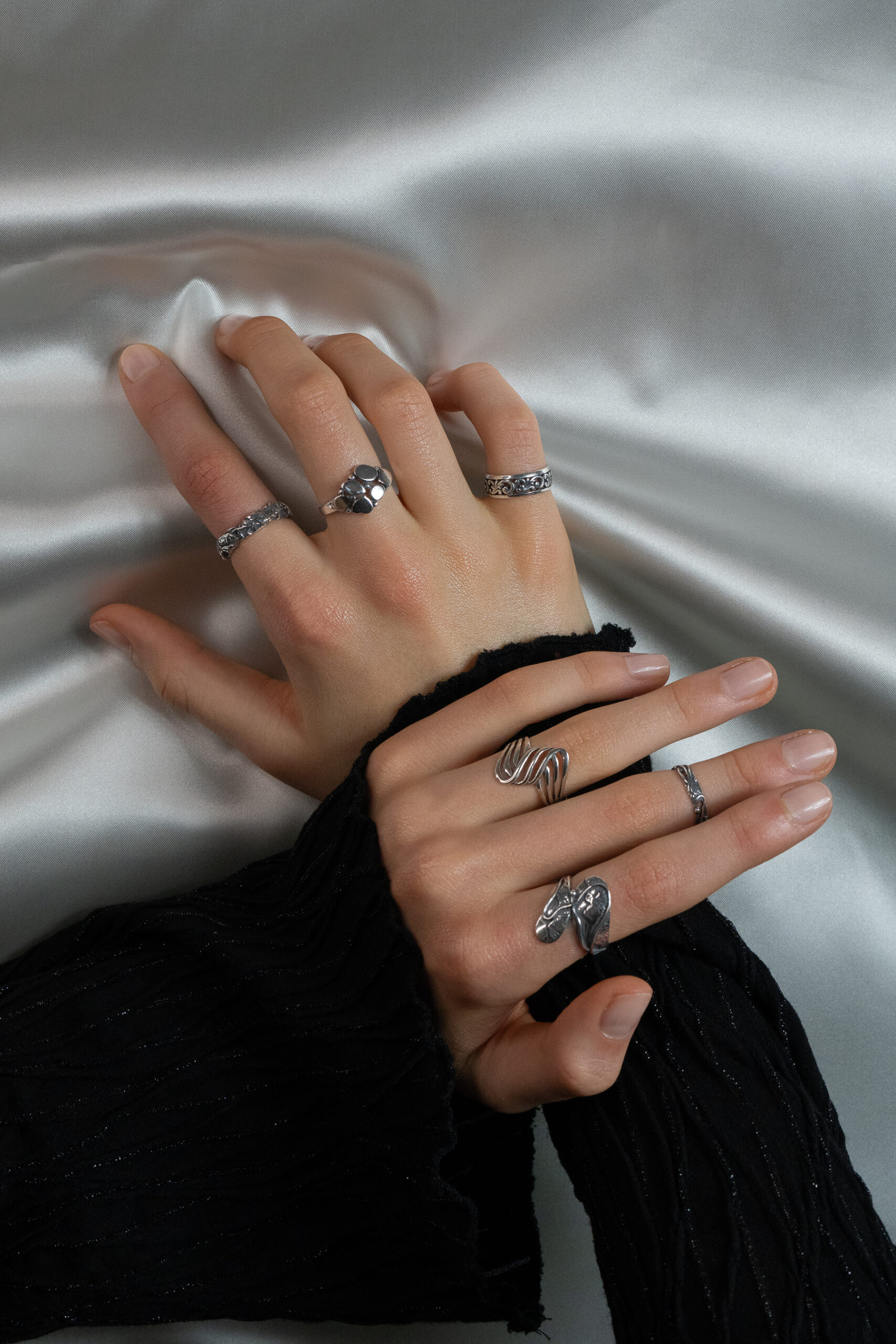 - Meniškas rankų darbo banguotos formos žiedas su raižytais ornamentais