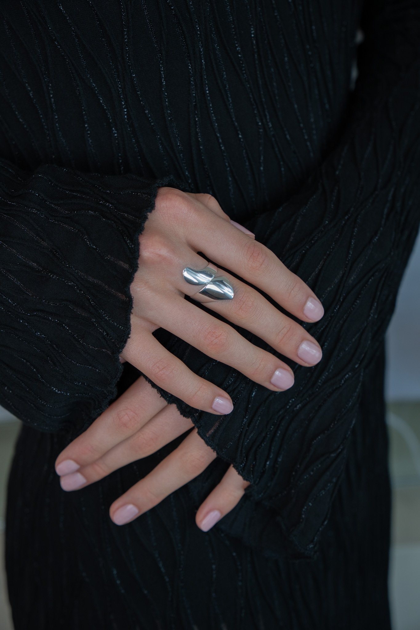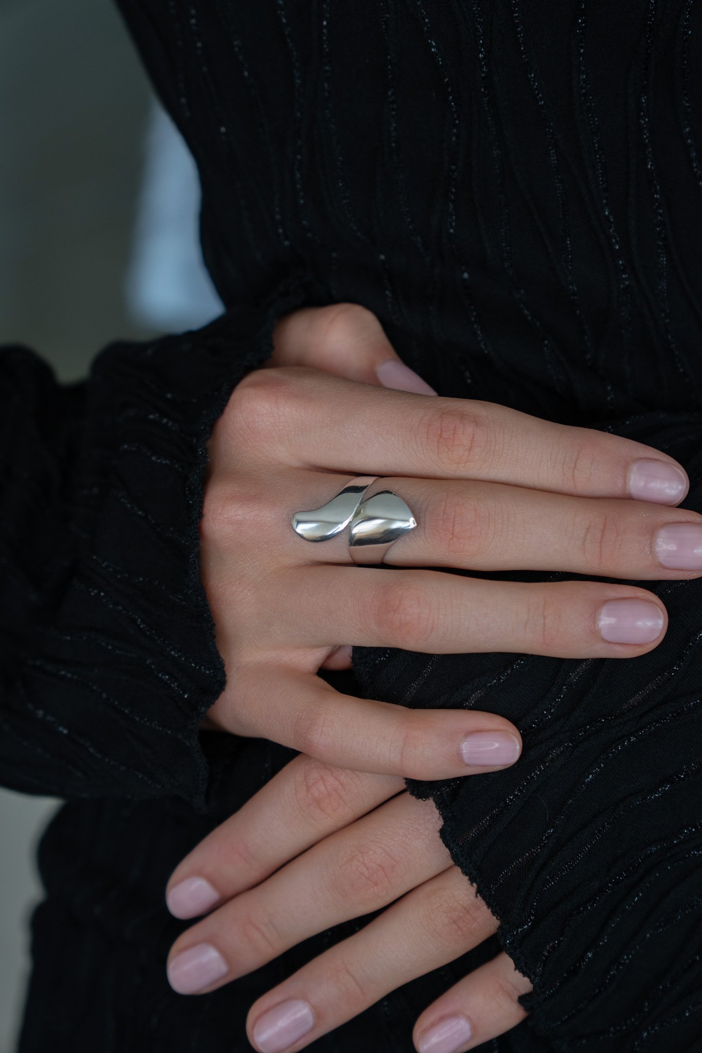 - Rankų darbo blizgaus sidabro žiedas. kurio skersmuo viršuje yra 2 cm.