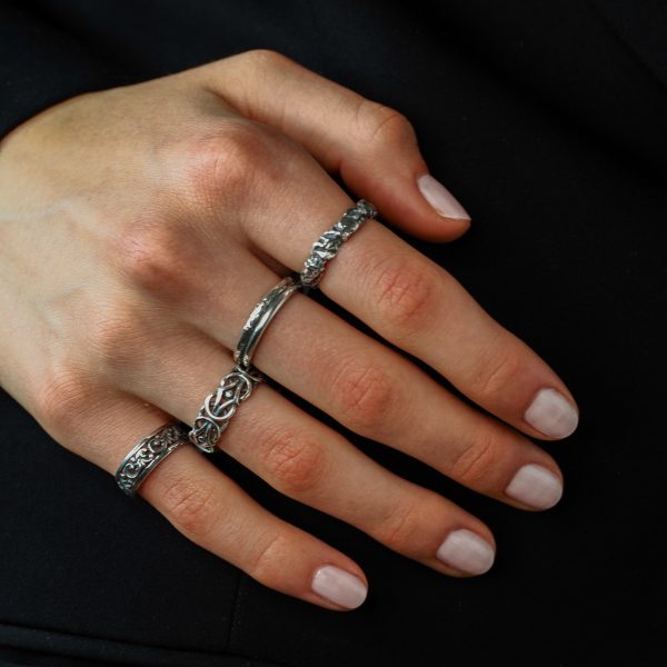 - Rankų darbo žiedas su tamsinto sidabro raštais lyg dailininko potėpiais